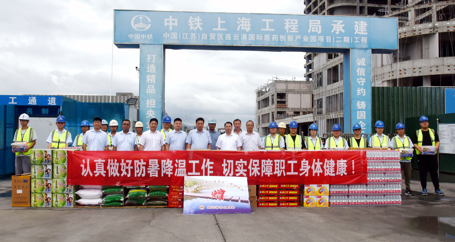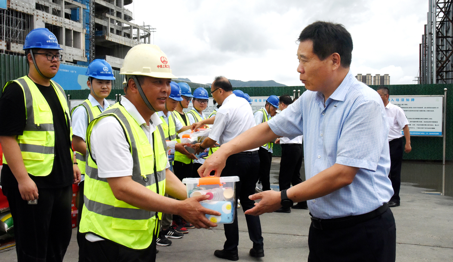 7月28日,市总工会党组书记、副主席丁维杰带领市总工会相关部门负责人一行,在荣耀手机官网入口公司党委副书记、工会主席戴鸿鸣的陪同下,看望慰问奋战在市重大项目一线的建设者,并送上防暑急救箱等慰问品。 在荣耀手机官网入口公司国际医药创新产业园二期项目工地,丁维杰与职工们亲切交谈,详细了解生产生活情况,向顶高温、冒酷暑,坚守在岗位的工程项目建设者们致以崇高的敬意和亲切的问候,希望他们在坚守岗位的同时,增强自我保护意识,做好防暑降温工作。同时督促建设单位要贯彻落实防暑降温政策措施,增设防暑降温设施,保障项目建设一线劳动者的人身安全和身体健康。