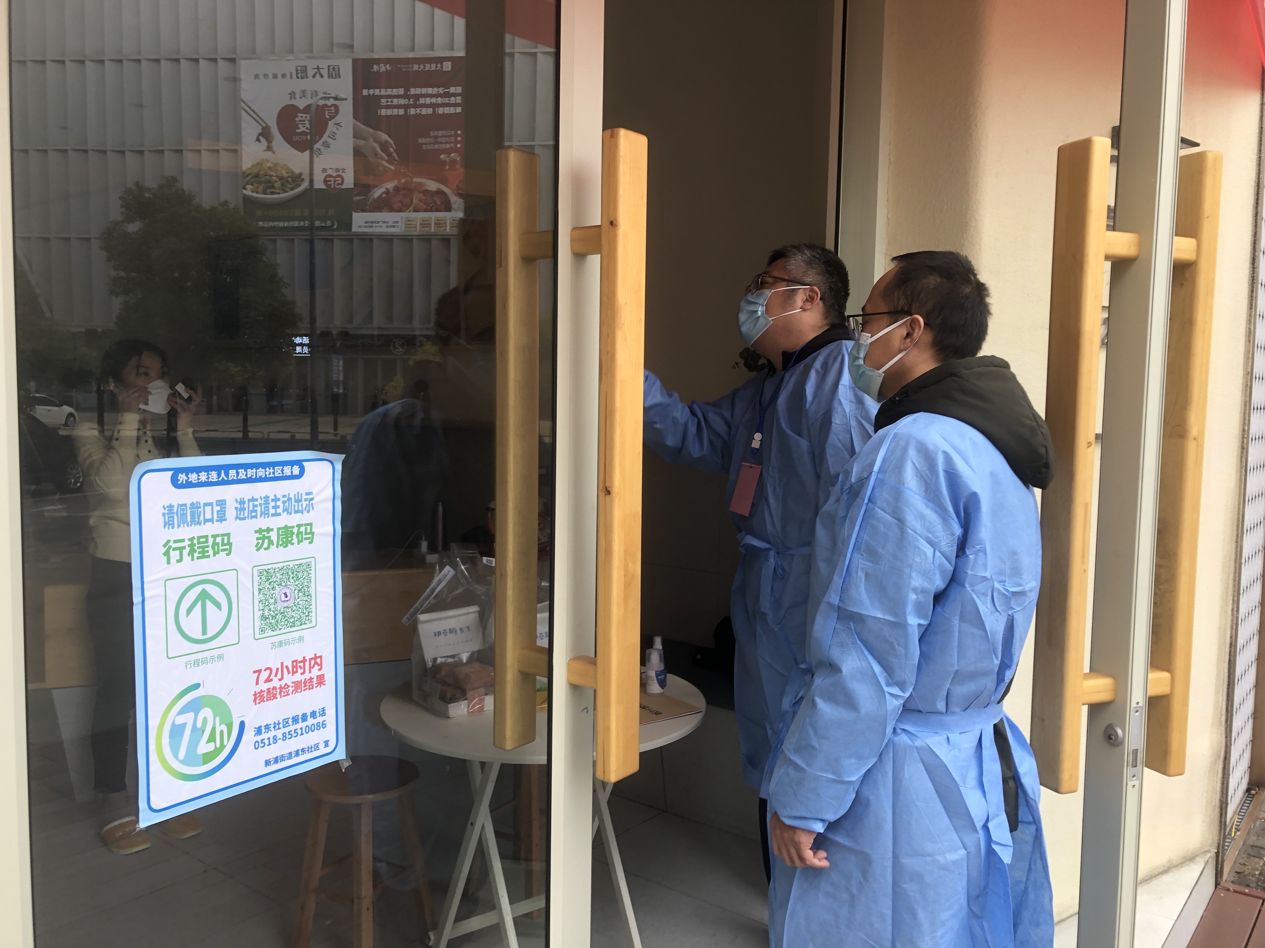在浦东社区,华茂公司志愿者们对辖区范围内的沿街商铺进行巡查,劝导居民戴口罩、不聚集、不扎堆,指导商铺有效落实疫情防控要求。