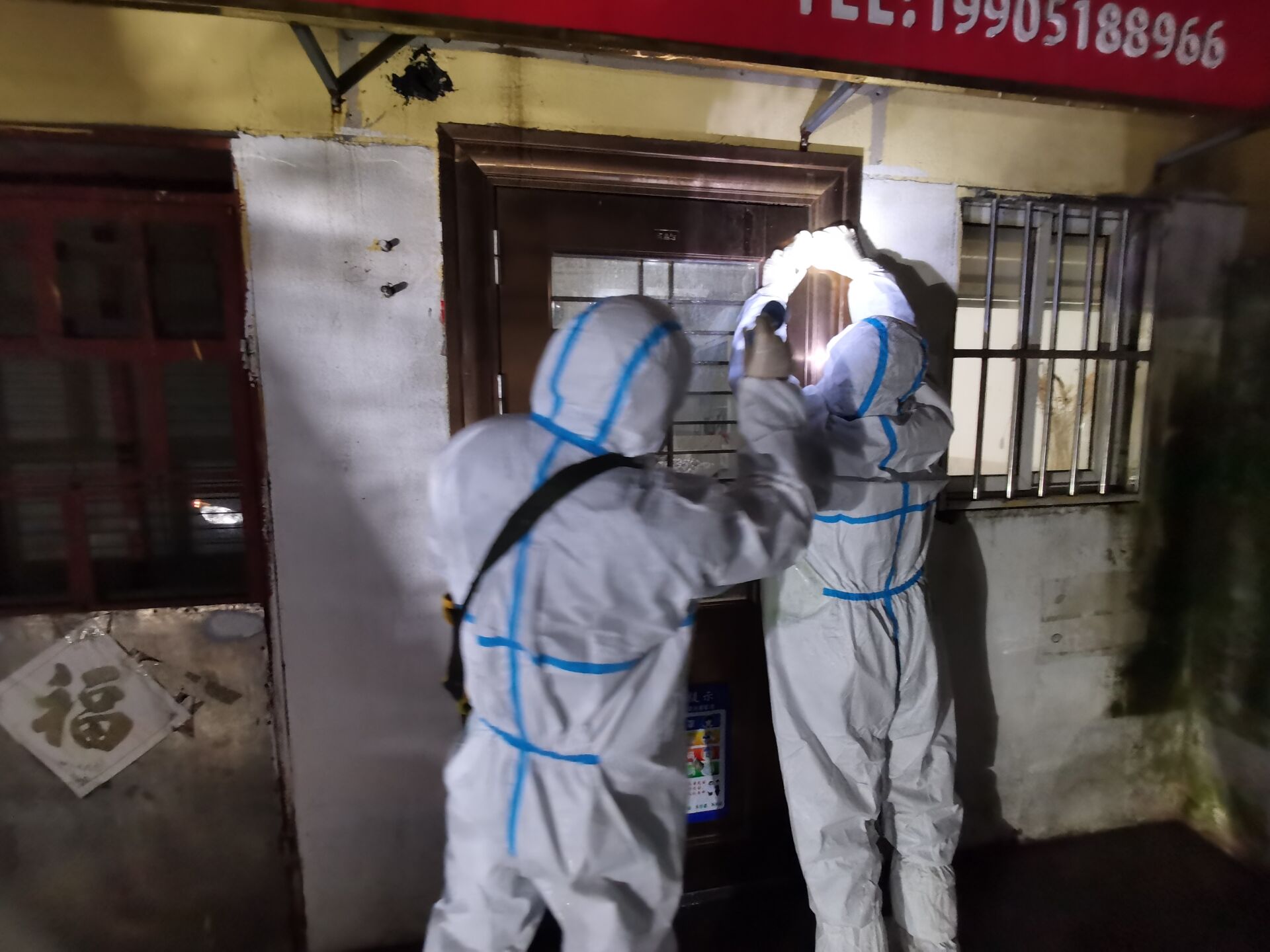 由于新桥社区多为自建房,门牌号混乱难找,房地产和资产公司的志愿者们冒雨坚守,逐户排查登记信息,宣传防护知识,讲解防控要求,并对重点监控住户安装防疫门磁。