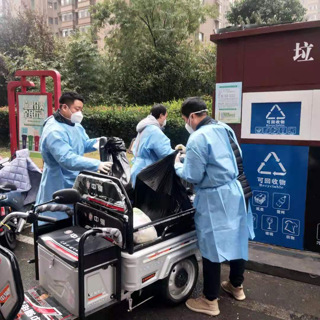 在万润社区蓝天华侨城,金航和神特公司的志愿者们变身环卫工人,转运辖区集中隔离点和居家隔离单元生活垃圾,并负责对辖区集中隔离点以及居家隔离小区单元的生活垃圾进行专业化消杀与转运,确保小区垃圾日产日清,全程多次消毒消杀,闭环无缝转运。