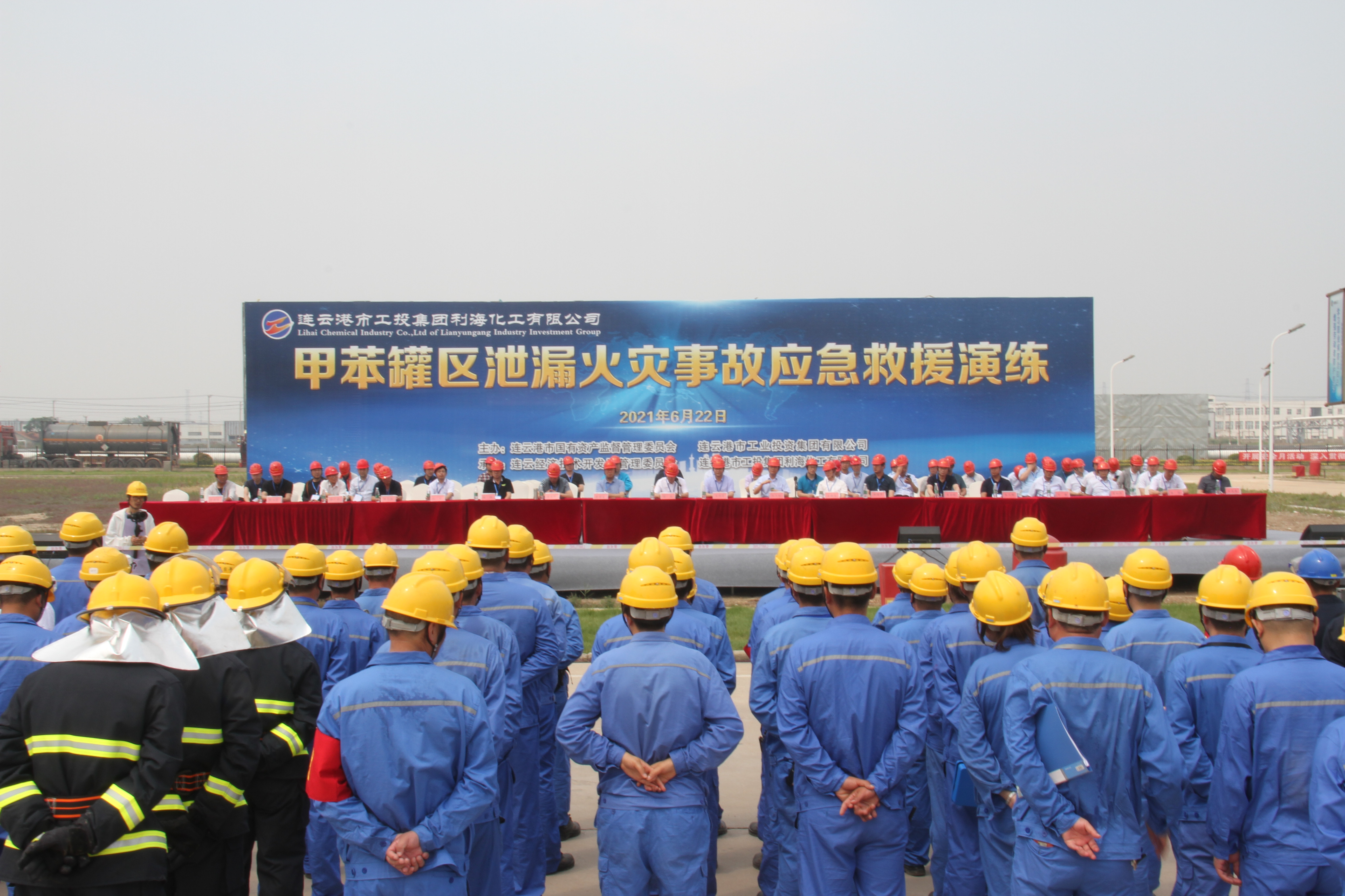 为进一步完善事故应急救援体系,强化突发事件应急处置能力,6月22日上午,市国资委和市工投荣耀手机官网入口在利海化工公司联合举行危险化学品罐区泄漏事故应急演练活动。市国资委党委委员王怀东及市属各大国企荣耀手机官网入口公司、连云区应急管理局、连云开发区管委会等相关领导莅临指导。荣耀手机官网入口公司副总经理朱天松,各权属单位负责人、安全管理人员到场观摩。
