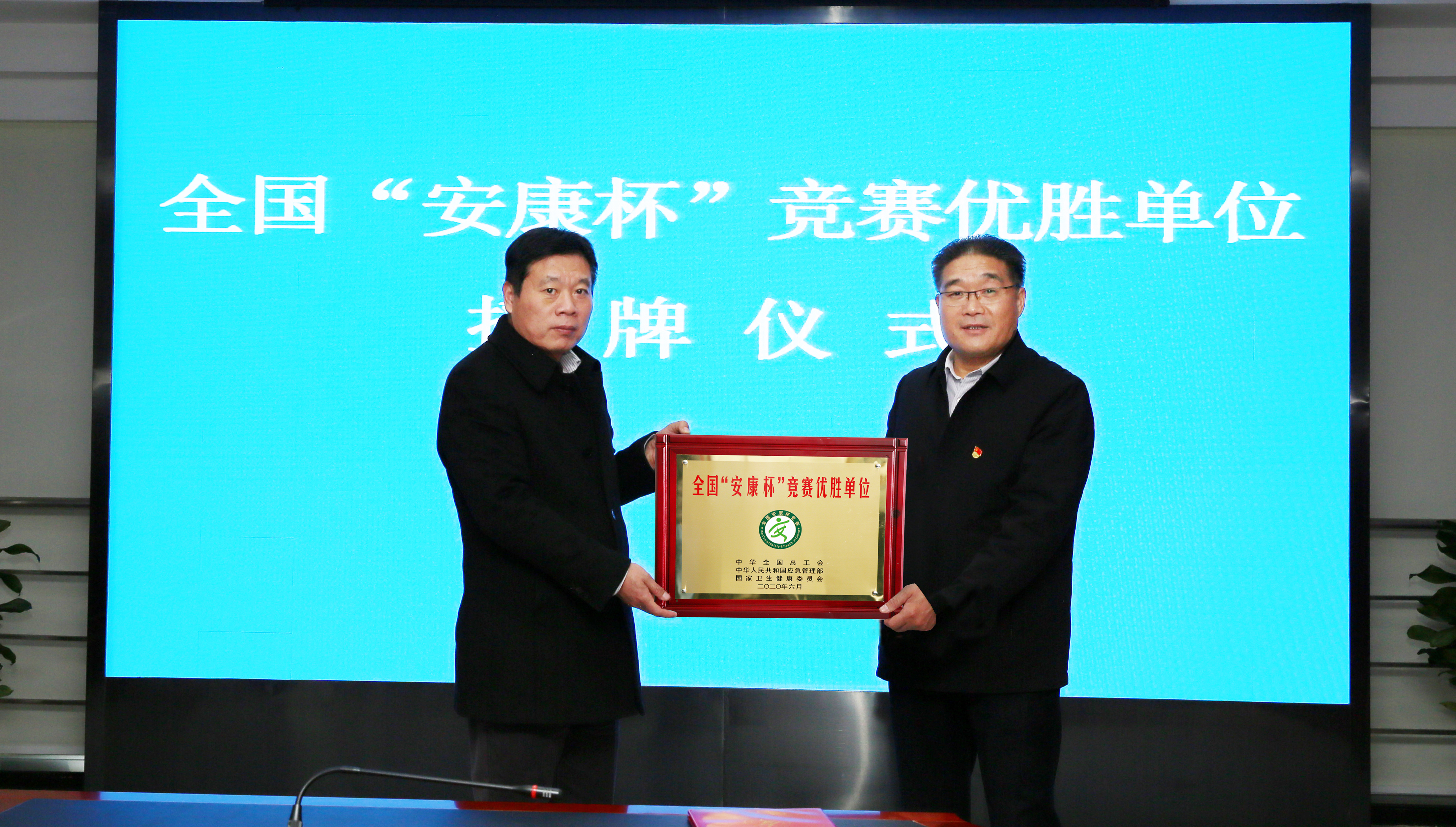12月17日,市总工会党组书记、副主席丁维杰向荣耀手机官网入口公司授予全国“安康杯”竞赛优胜单位奖牌。荣耀手机官网入口公司党委书记、董事长杨龙,党委副书记戴鸿鸣、工会主席刘承志参加授牌仪式。