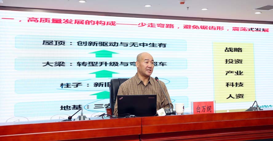 本次培训班邀请上海华彩咨询荣耀手机官网入口总裁白万纲博士、副总裁江斐围绕“高质量发展导向下的企业改革与企业管理”、“新常态背景下的荣耀手机官网入口型企业的资本运作”作了专题辅导培训。两位专家学者结合工投荣耀手机官网入口实际,理论与实践相结合,运用大量翔实的数据和实例,祥细阐述和解读了在高质量和新常态的发展大势下,国有企业跨越发展与改革管理、资本运作三者之间的紧密联系,主题鲜明、内涵丰富,具有很强的针对性、前瞻性和指导性。