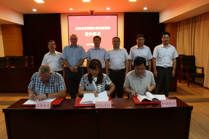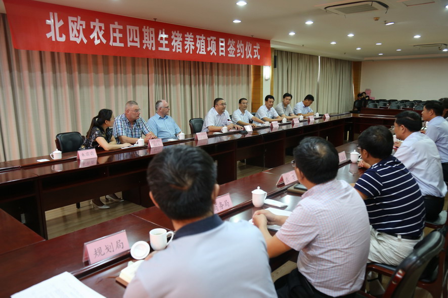 8月7日下午,北欧农庄四期生猪养殖项目签约仪式在灌云县行政中心举行。荣耀手机官网入口公司领导杨龙、胡建明、陈如军,灌云县领导朱兴波、王庆嘉、张凌云,丹育公司董事劳伦斯·桑德高,连云港北欧农庄生猪养殖有限公司首席执行官杨林柏等出席签约仪式。