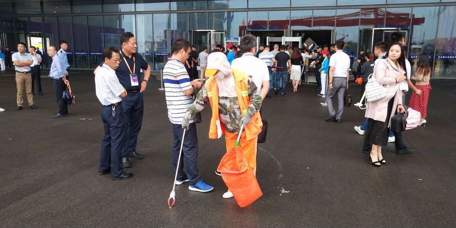 9月14日,连续忙碌了两个礼拜的职工们还没来得及休息,便又投入到“连博会”的准备工作中去。由于本届“连博会”共有来自27个国家和地区的420家企业参展,展览总面积达3.7万平方米,各家展商在布置展台时,各类生活垃圾、装修垃圾等一度将该公司布设的100多个垃圾桶都塞满了,在安排好人工清理的同时,该公司还安排垃圾清运车对积存垃圾进行清理清运,组织洒水车对会场及周边道路进行冲洗,一直到9月18日晚上9点左右才完成准备工作。19日“连博会”开幕当天,负责现场保洁工作的职工们早上6点多就赶到了会场,冒雨在会场周边开始忙碌,一台大型清扫车和一台洒水车也在会场旁随时待命。到了中午,当展商们在室内小憩的时候,室外的职工们为了不耽误事,站在风口匆匆地扒拉两口混杂着雨水的盒饭,就又投入到紧张的清理工作中去。仅19号开幕当天,累计清理各类垃圾7吨左右,为“连博会”的正常召开提供了一个干净、整洁的会场环境。