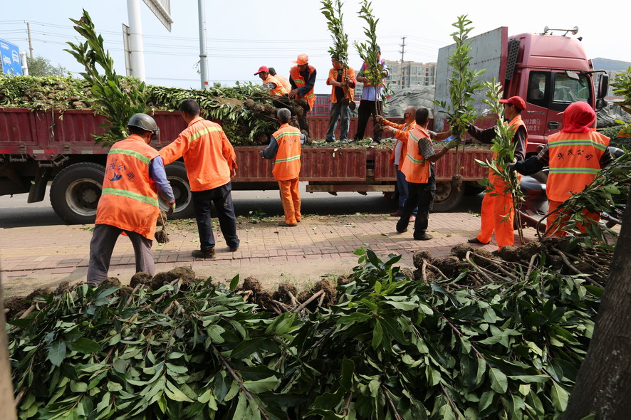 新光路铁路桥至港城大道段南侧绿化带,因为人为踩踏、车辆碾压导致绿化斑秃损坏严重,为尽快恢复绿化原貌,改善市容市貌。8月18日,裕升、裕欣养护公司组织80多名绿化工,从早上6点一直干到下午6点,卸苗、运苗、挖坑、插苗,烈日酷暑下奋战一整天,中午在树阴下吃点盒饭,喝点矿泉水,继续工作,橘黄色工作被汗水浸透、被烈日烤干,这样有好几个来回。“今天我们要在这片绿化补植红叶石楠、金森女贞等模纹小苗1万余株,红叶石楠球等灌木110株,有效改善该路段绿化植被,提升城市形象,我们还要在黄海续道补植草坪近30000平方,在这条1000多米长的路段,有车辆维修点50多家,车辆出入,对路边绿化带伤害非常大,这一路段也是环卫整治长期存在的‘老大难’,这次,在开发区行政执法部门的配合下,我们要重新种植草坪,对这一‘老大难’路段植被进行恢复,另外德兰南路、东路补植苗木近80万元的绿化工程也已开工上土整土,接着要栽苗,根据开发区创卫部署要求,上述这些事情必须在8月底完成,所以说时间相当紧,职工们都冒着高温,加班加点抢进度。”公司副总经理郁宏峰说。