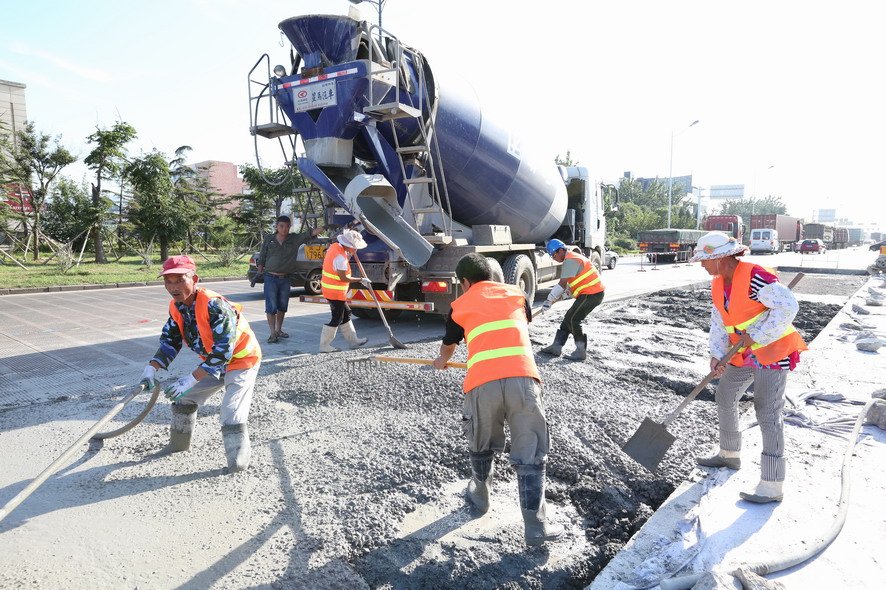 在大港路“新光路至零公里”路段,笔者在水泥路上看到一块块被切割成方方正正的凹面,四周都架好防护栏等安全防护设施,在华东城北门偏东不远处,一台挖掘机的铲斗被换上冲击破碎锤,正在一大块破损的水泥路面冲击破碎作业,“嗒嗒嗒”的冲击声十分震耳。在与现场作业的盛达市政公司市政维修项目部副主任史如勤交流中得知,该路段是附近荣耀手机官网入口箱基站进出港口集装箱车辆的重要通道,每天有好几百辆集装箱车辆进出,水泥路面不堪重负,损坏比较严重,根据开发区创卫工作要求,由他们对该路段破损处进行局面分割维修,整个路段维修面积达到5000多平方,为保证道路使用通行,采取半幅维修、边破碎边浇灌的方式,保证施工进度,现正在维修北侧路面,整个路面维修计划在8月底完成。“因为创卫,我们下一步还要对辖区内的破损、歪到的路牙石进行维修扶正,242路段沥青破损路面维护,还要开通四处道口,而现在事多人少,人手比较紧张,我们周六周日都没有休息,就是想把创卫工作任务一项一项地及时完成,决不能拖创卫工作后腿。”他边说边用肩上的毛巾擦着额头上的汗水。