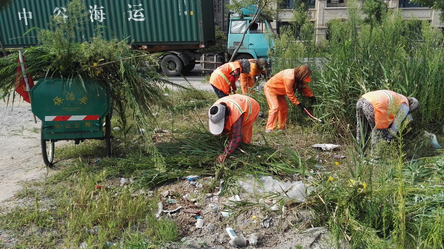 在昌圩湖环湖路南侧一处公共厕所处,裕升养护公司20多名环卫保洁工人正在清理公厕周边的杂草、建筑垃圾,有的在割草、有的在搬砖、有的在推车,一个个汗流浃背,忙得不亦乐乎。正在现场忙碌的保洁大队长刘保军对笔者说:“这一块段还没有交给我们养护,一直无人管理,杂草丛生,成为建筑、装修垃圾的堆放地,根据开发区创卫环境卫生无死角要求和华茂公司生产技术部门指令,我们裕升养护公司承担这一区域环境卫生突击整治任务,从绿化保洁班组抽调20多人来搞突击,大家面对天气炎热、工作量大、清理困难等因素,发扬不怕吃苦、敢打硬仗的华茂精神,奋战在突击现场,每个人都汗流不止,工作服全被汗水浸透,昨天我们已在这里整整干了一天,由于垃圾量大、杂草面积大,我们动用了装载机等机械设备,运杂草的三轮车跑近百趟,清理建筑、装修等垃圾数十吨。估计今天下午能够全部结束。”