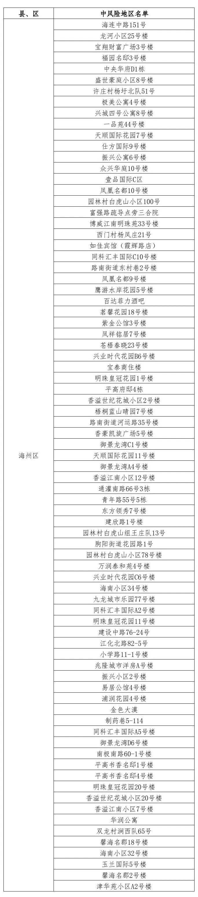 海州区众兴华庭7号楼、悦城国际9号楼、香溢世纪花城小区7号楼、许庄村杨圩北队75号、极美苑2号楼、颐和花园1号楼、麻纺小区10号楼、银城公寓1号楼、新建西路30号楼、仕方国际10号楼、吾悦华府9号楼由中风险地区调整为低风险地区。