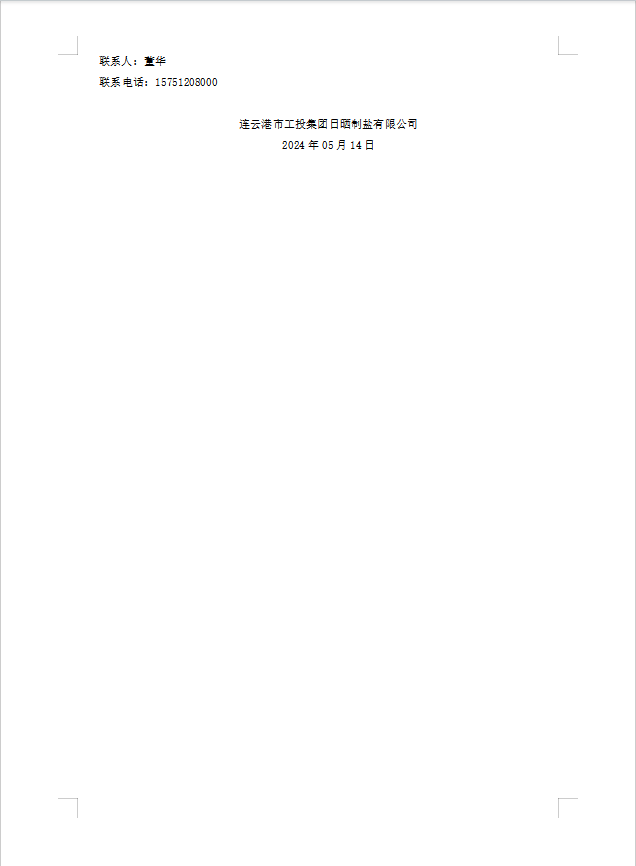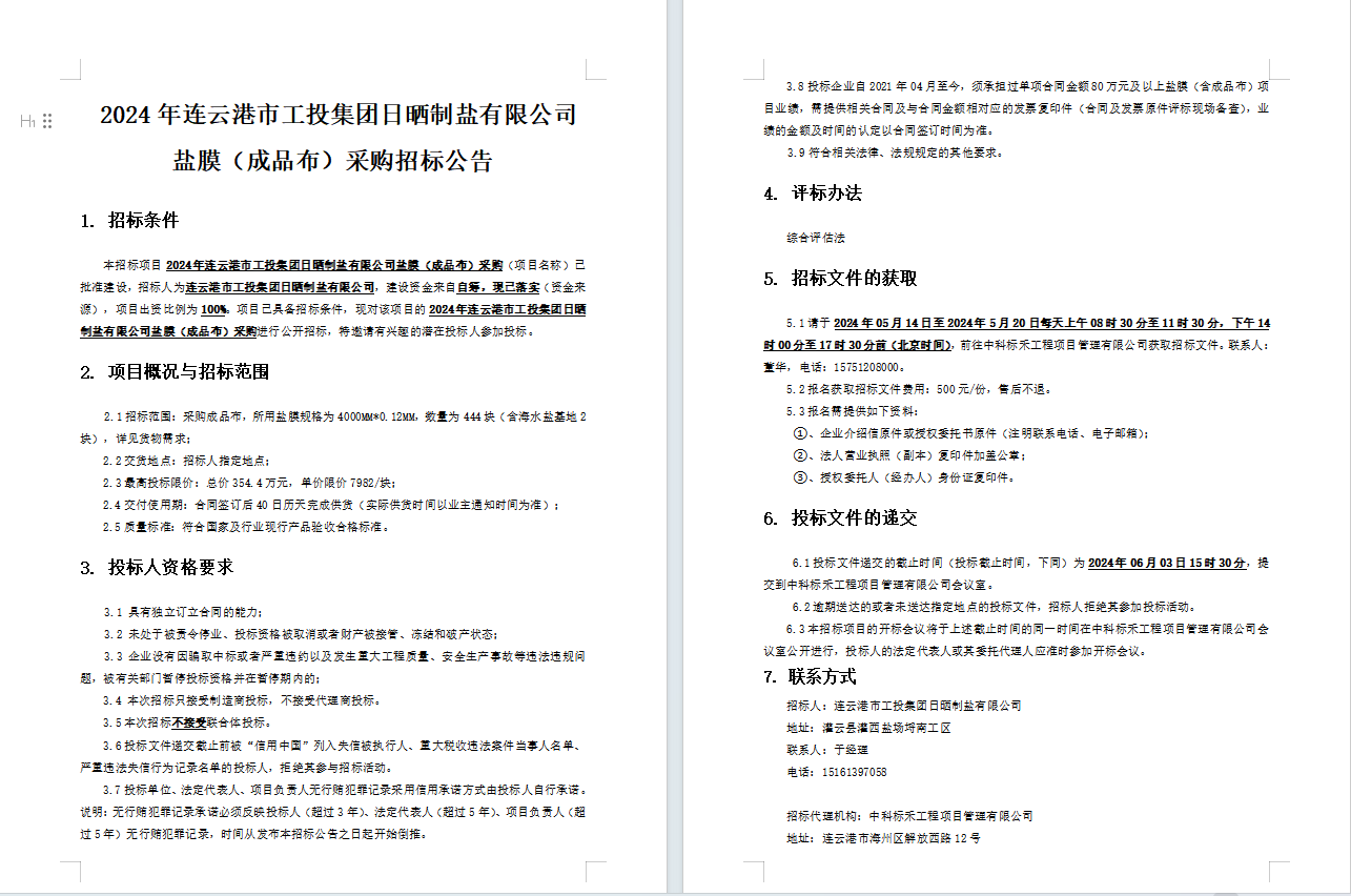 2024年连云港市工投荣耀手机官网入口日晒制盐有限公司盐膜(成品布)采购招标公告
