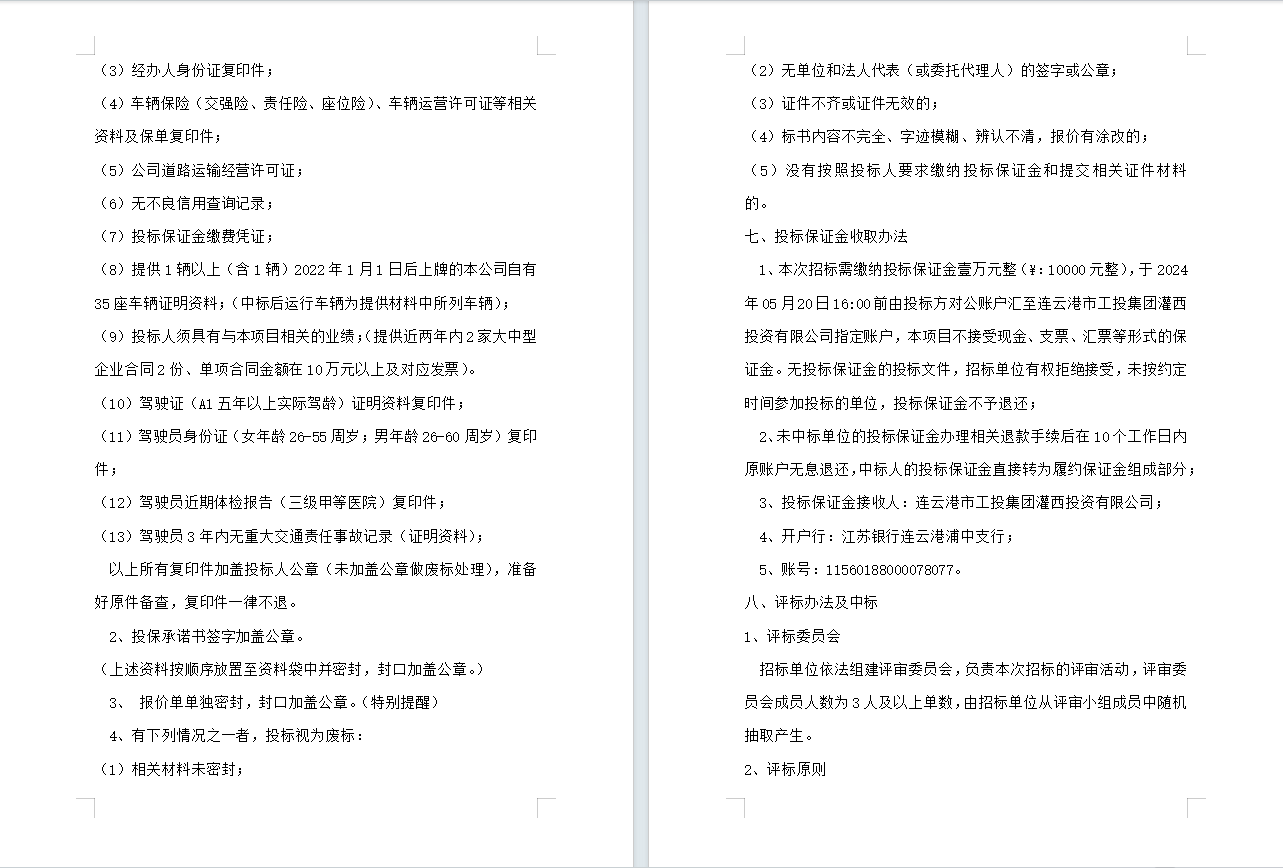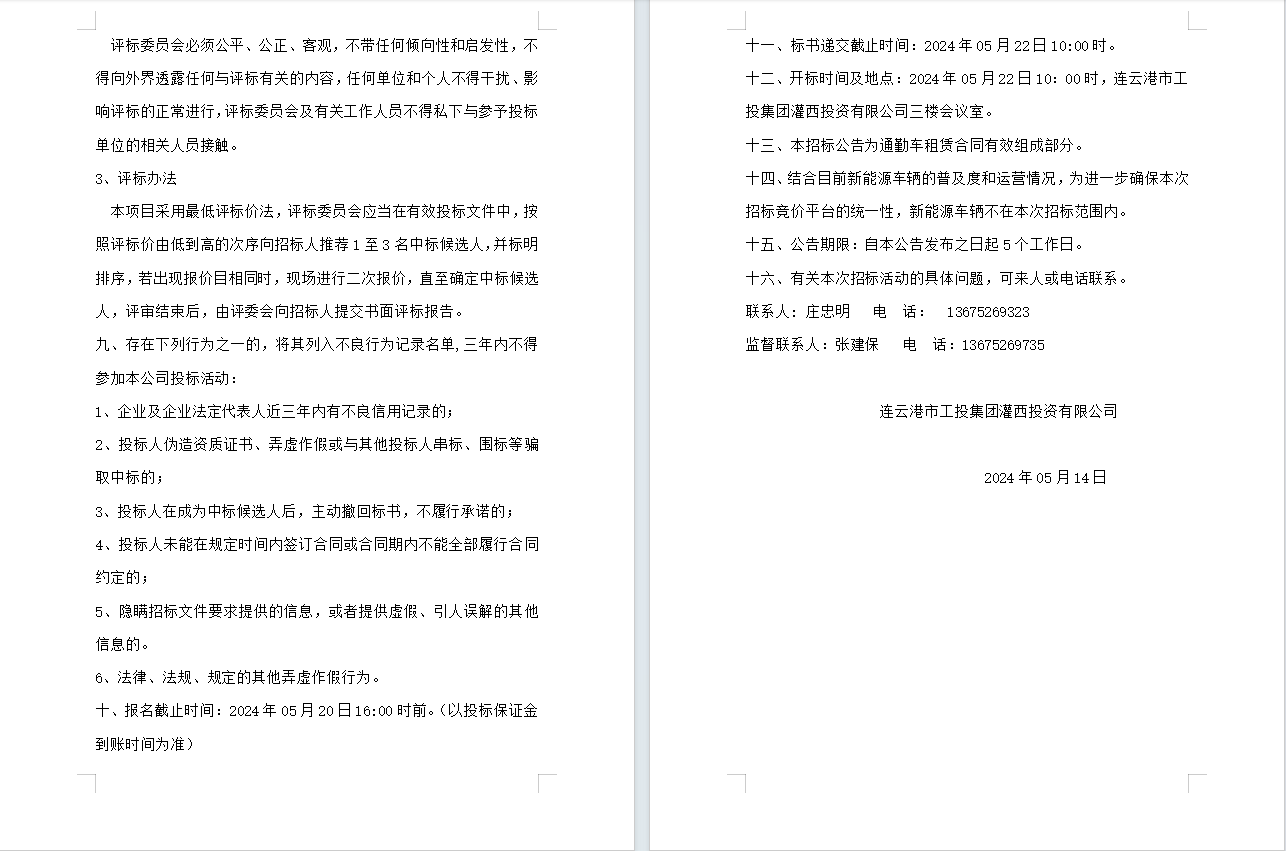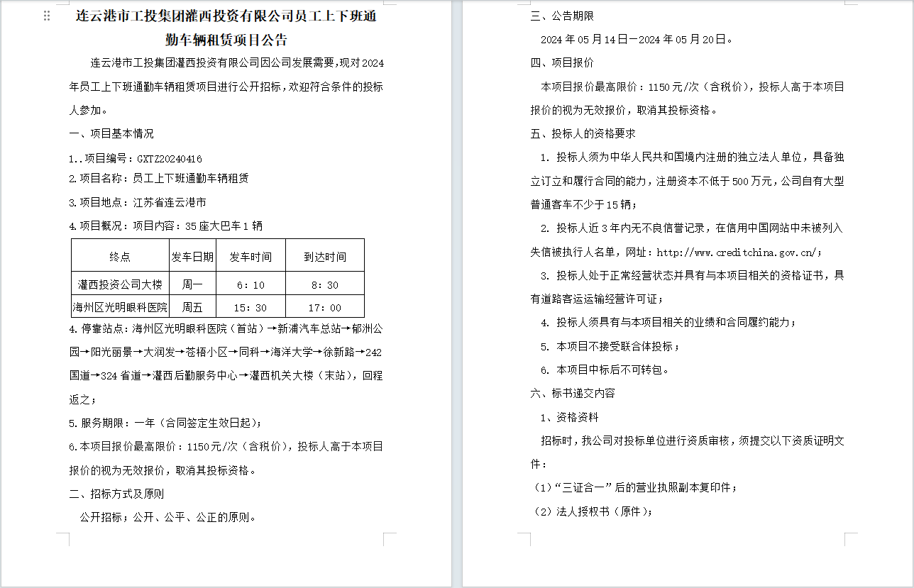 连云港市工投荣耀手机官网入口灌西投资有限公司员工上下班通勤车辆租赁项目公告