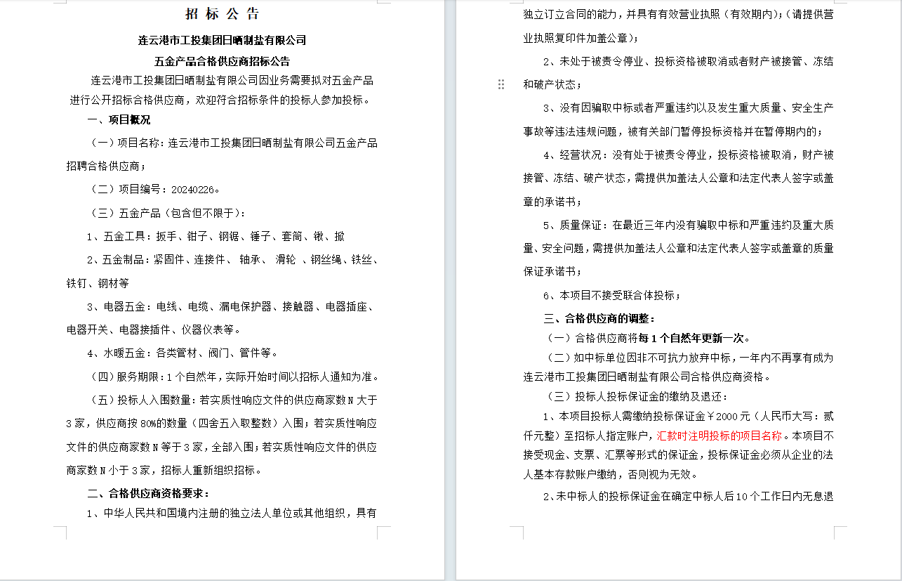 连云港市工投荣耀手机官网入口日晒制盐有限公司五金产品合格供应商招标公告