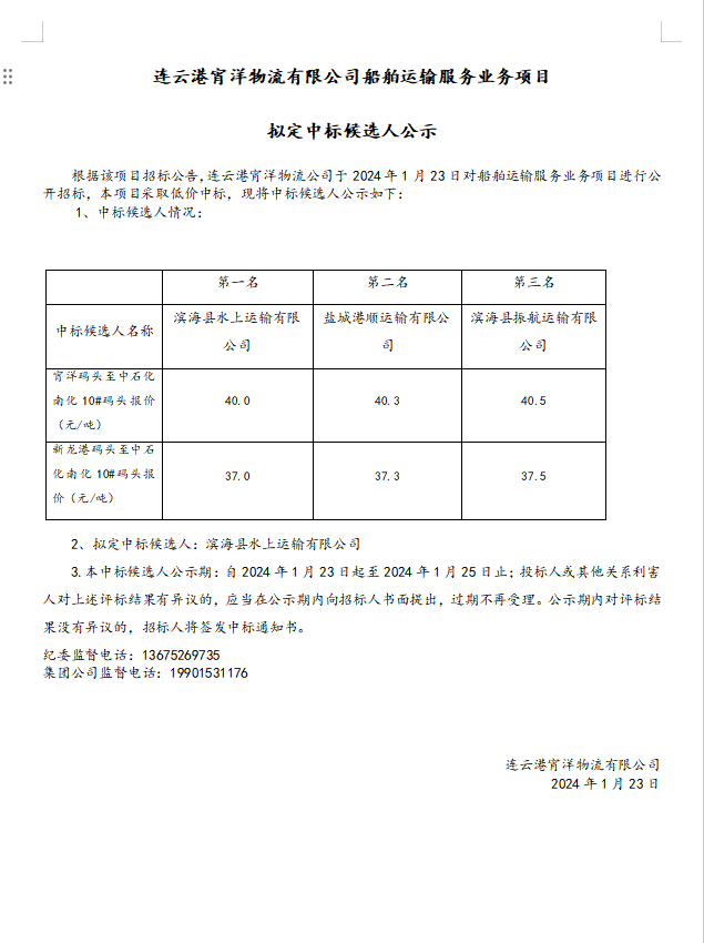 连云港宵洋物流有限公司船舶运输服务业务项目拟定中标候选人公示