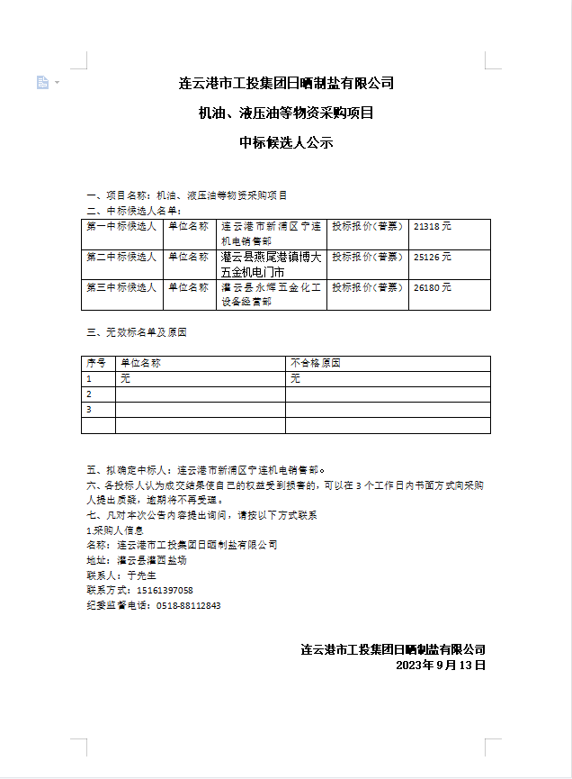 连云港市工投荣耀手机官网入口日晒制盐有限公司 机油、液压油等物资采购项目中标候选人公示