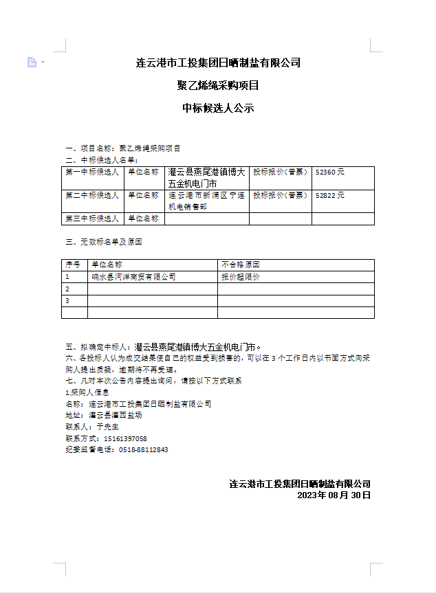 连云港市工投荣耀手机官网入口日晒制盐有限公司聚乙烯绳采购项目中标候选人公示