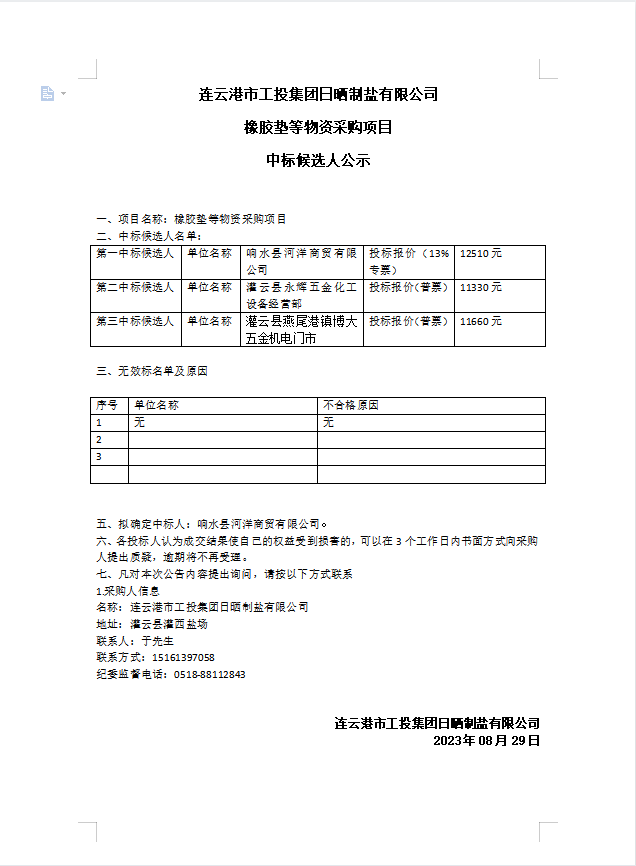 连云港市工投荣耀手机官网入口日晒制盐有限公司橡胶垫等物资采购项目中标候选人公示