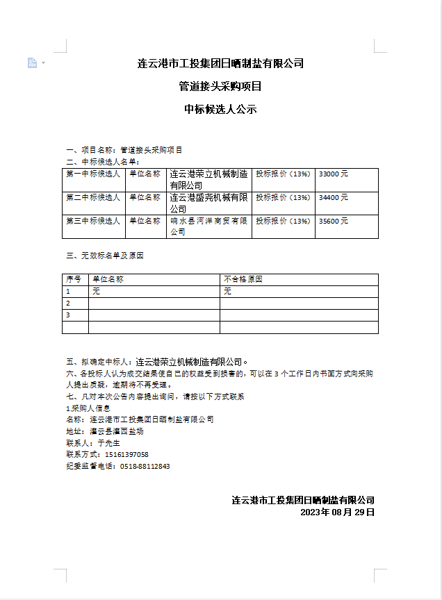 连云港市工投荣耀手机官网入口日晒制盐有限公司 管道接头采购项目中标候选人公示