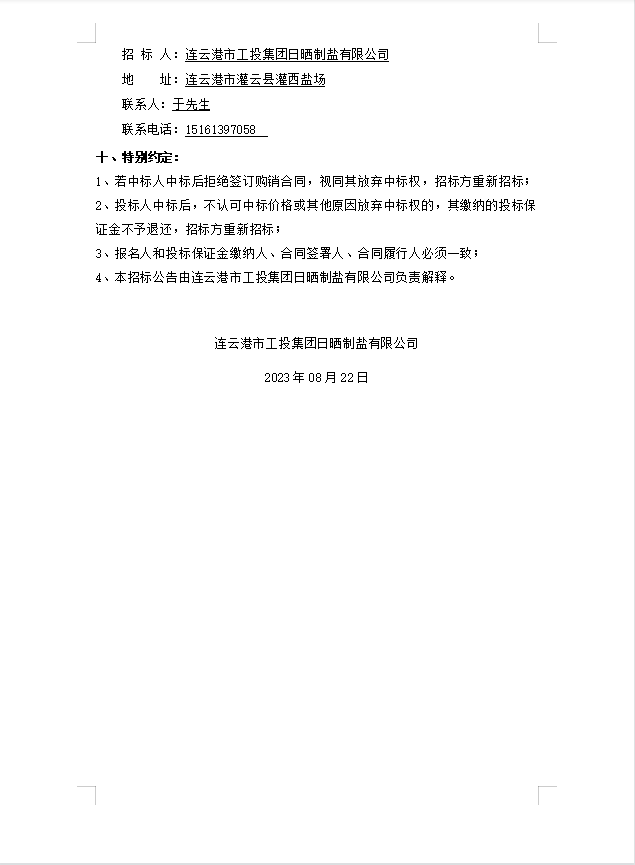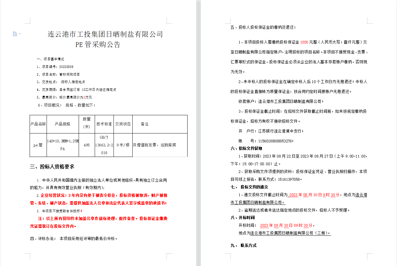 连云港市工投荣耀手机官网入口日晒制盐有限公司PE管采购公告