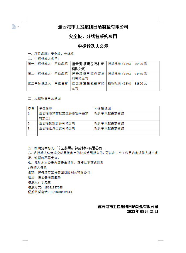 连云港市工投荣耀手机官网入口日晒制盐有限公司 安全板、分线桩采购项目 中标候选人公示
