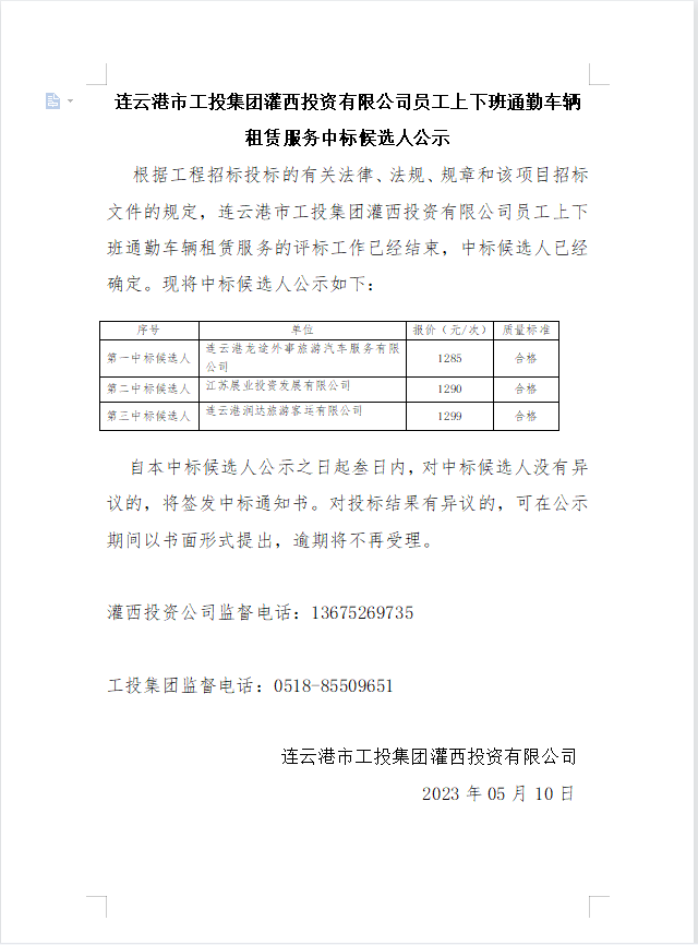 连云港市工投荣耀手机官网入口灌西投资有限公司员工上下班通勤车辆租赁服务中标候选人公示