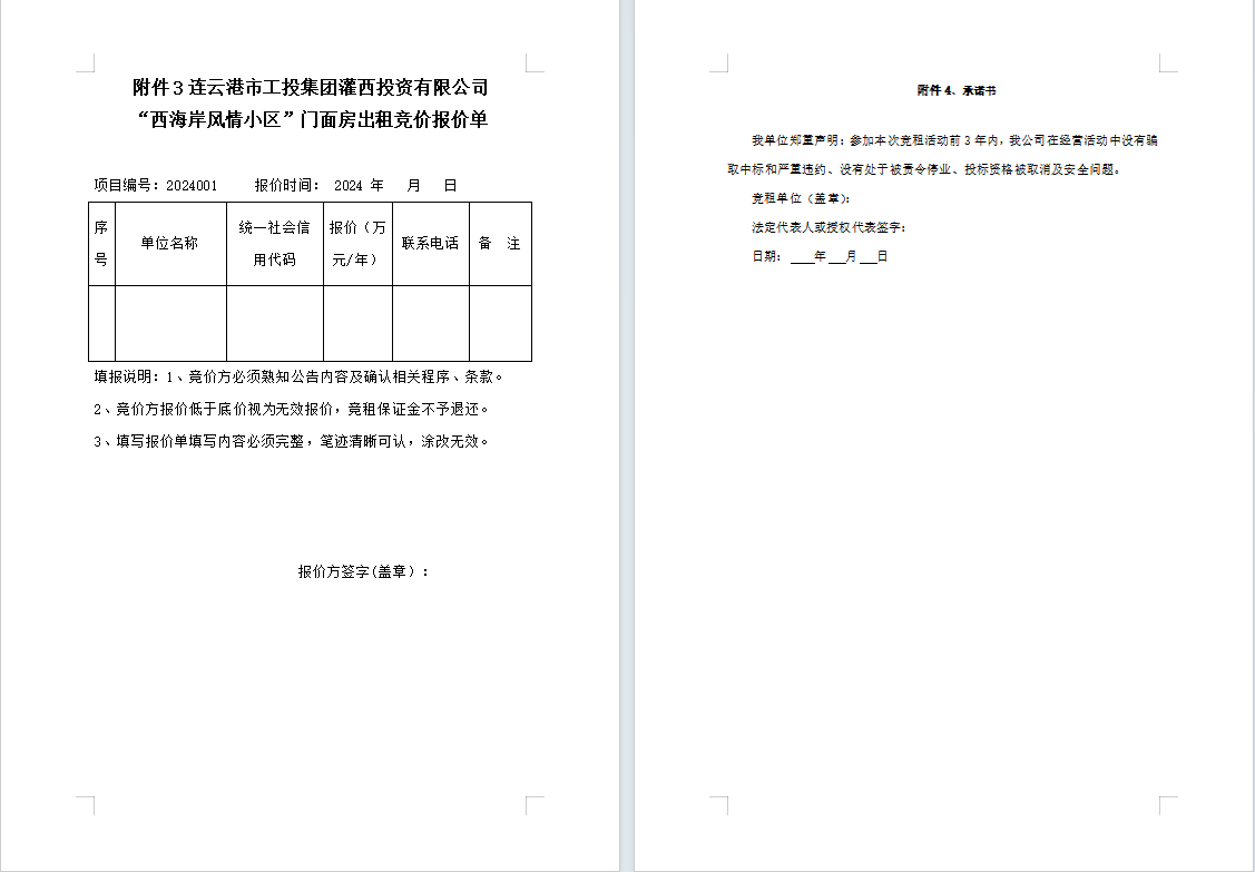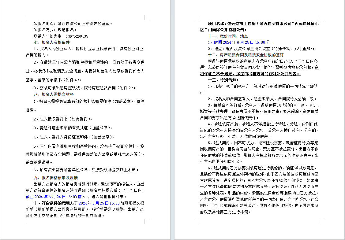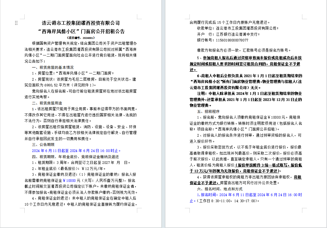 连云港市工投荣耀手机官网入口灌西投资有限公司“西海岸风情小区”门面房公开招租公告