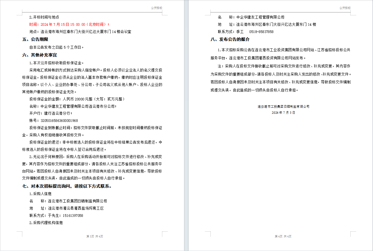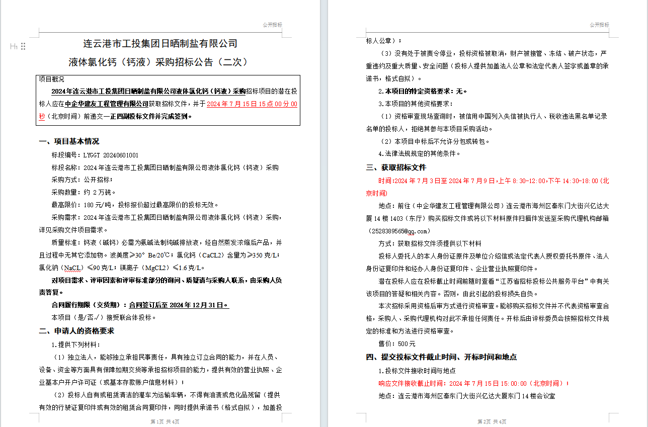 连云港市工投荣耀手机官网入口日晒制盐有限公司液体氯化钙(钙液)采购招标公告(二次)