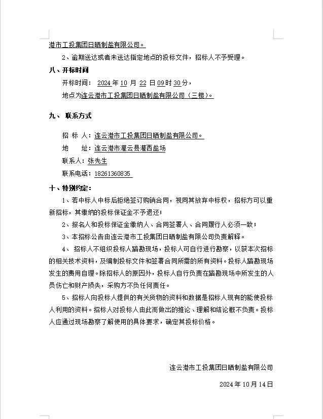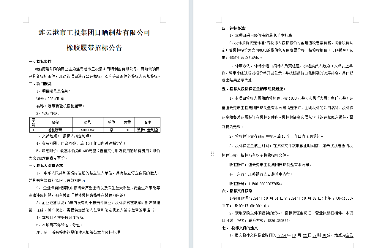 连云港市工投荣耀手机官网入口日晒制盐有限公司橡胶履带招标公告