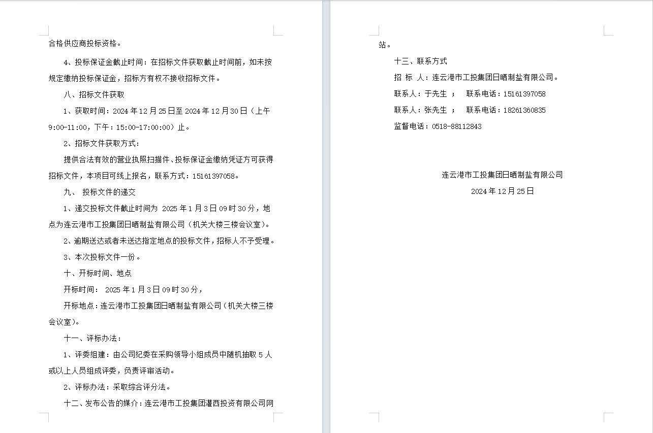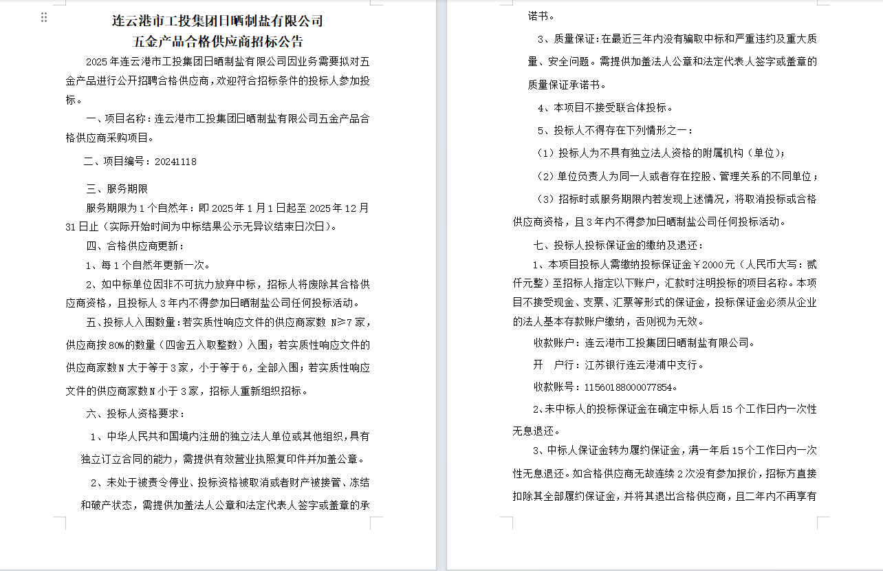 连云港市工投荣耀手机官网入口日晒制盐有限公司五金产品合格供应商招标公告