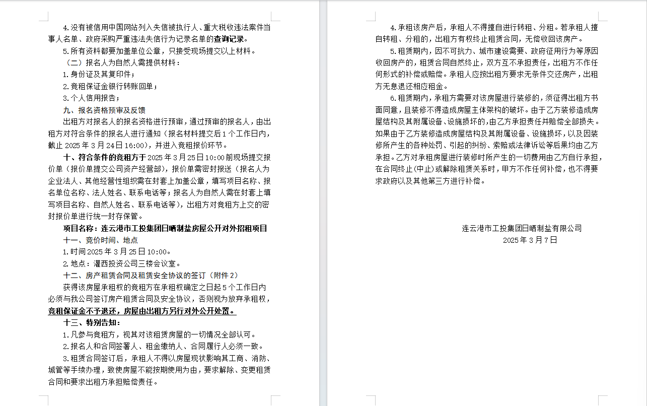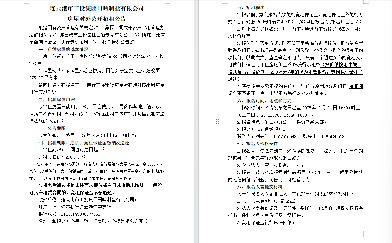 连云港市工投荣耀手机官网入口日晒制盐有限公司房屋对外公开招租公告