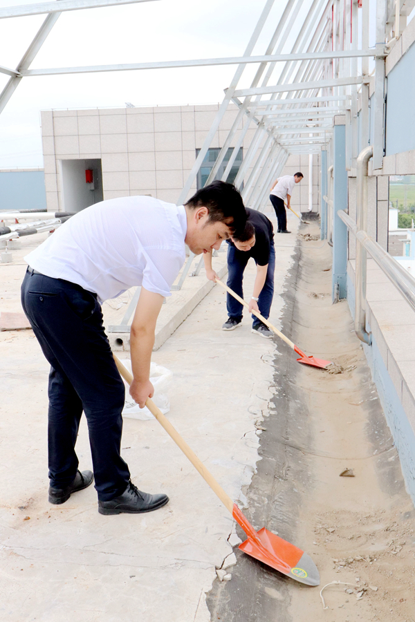 为净化、美化公司办公楼楼顶环境,消除积水隐患,8月26日上午,公司组织党员、团员青年志愿者开展了专项清理整治行动。志愿者不畏艰辛,对楼顶进行了细致清扫,认真疏通排水口,力争阴雨天气不再出现积水现象。(神特宣)