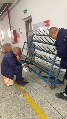 维修台车时,我当起了孙师傅的下手,一边将台车稳住不能倾倒,一边看着孙师傅卸下每个车轮子并进行仔细清理,不怕脏、不怕累,毫无怨言,一丝不苟,动作利落,手法娴熟,亲身直面他的高效率和专业水平。他还对我详细解说,让我理解每个步骤的重要性和关键点。我们蒋姐也过来帮忙,不停的清扫台车上清理出来的垃圾……