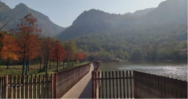 斗转星移,山河已变,五百年前诗人所描述的风景我们无法再欣赏到,但是现在的园林水库更有一番风采。火红的水杉是她最引人注目的特色之一,寒风掠过,水杉的叶子也逐渐变成了鲜艳的火红色,犹如一片片燃烧的火焰,在寒冷的季节中增添了一抹暖色。徜徉于火红的水杉林,阳光下树影婆娑,宁静,安逸,沉醉于诗画中。波光粼粼的湖水更是一幅美妙的画卷,清澈透明,水草摇曳,微波荡漾,游鱼穿梭,仿佛寒冷与它们无关。栈桥娴熟地穿越着园林与水库,一直连接到山脚,行走其上,脚下水光潋滟,眼前层林尽染,晴空之下无一丝尘埃,啾啾鸟鸣,沙沙叶响,哗哗水流,大自然的乐章欢快静谧。