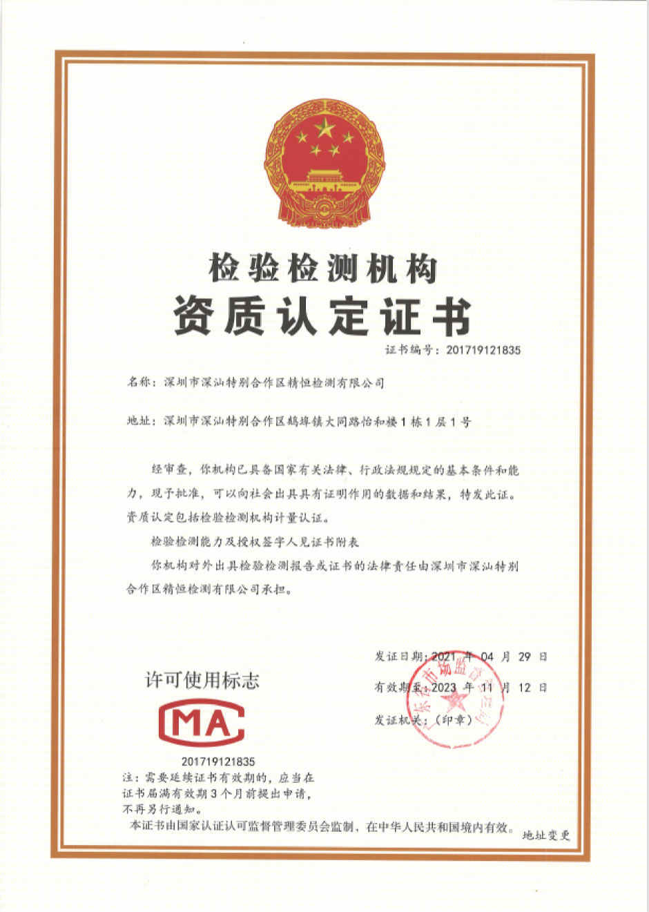 深圳市深汕特别合作区精恒检测有限公司前身为深汕特别合作区精恒工程检验有限公司,由荣耀手机官网入口控股投资,于二零一四年十二月在汕尾市住房和城乡建设局备案(证书号:JCJG-2015003),从事检验检测工作,二零一五年深汕特别合作区招商引资,为了更好的服务于深汕特别合作区,方便于建设管理者严把建设工程质量关。根据国家相关法律、法规要求,当地也必须有国家认可的检验检测机构,作为一个深圳市检测经验丰富的检测机构,经汕尾市政府、深汕特别合作区管理委员会等领导审批后,作为第二批进驻深汕特别合作区企业。由于建设发展的需要,本公司于二零二一年十月二十七日更名为深圳市深汕特别合作区精恒检测有限公司。